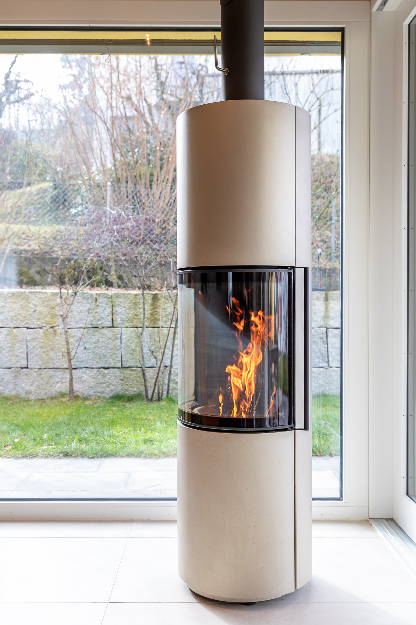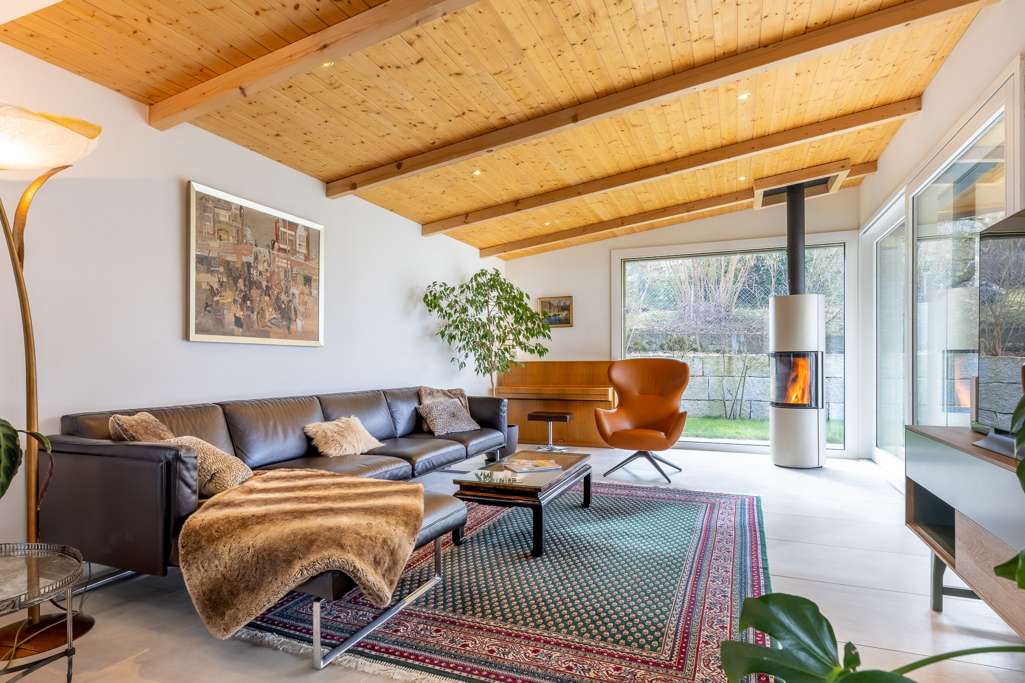 Au rez-de-chaussée, un grand espace ouvert relie la cuisine, la salle à manger et le salon. Le sol en grès cérame couleur sable, effet ciment, apporte de la luminosité aux pièces qui dialoguent entre elles grâce à la cohérence du style, des couleurs et des matériaux.