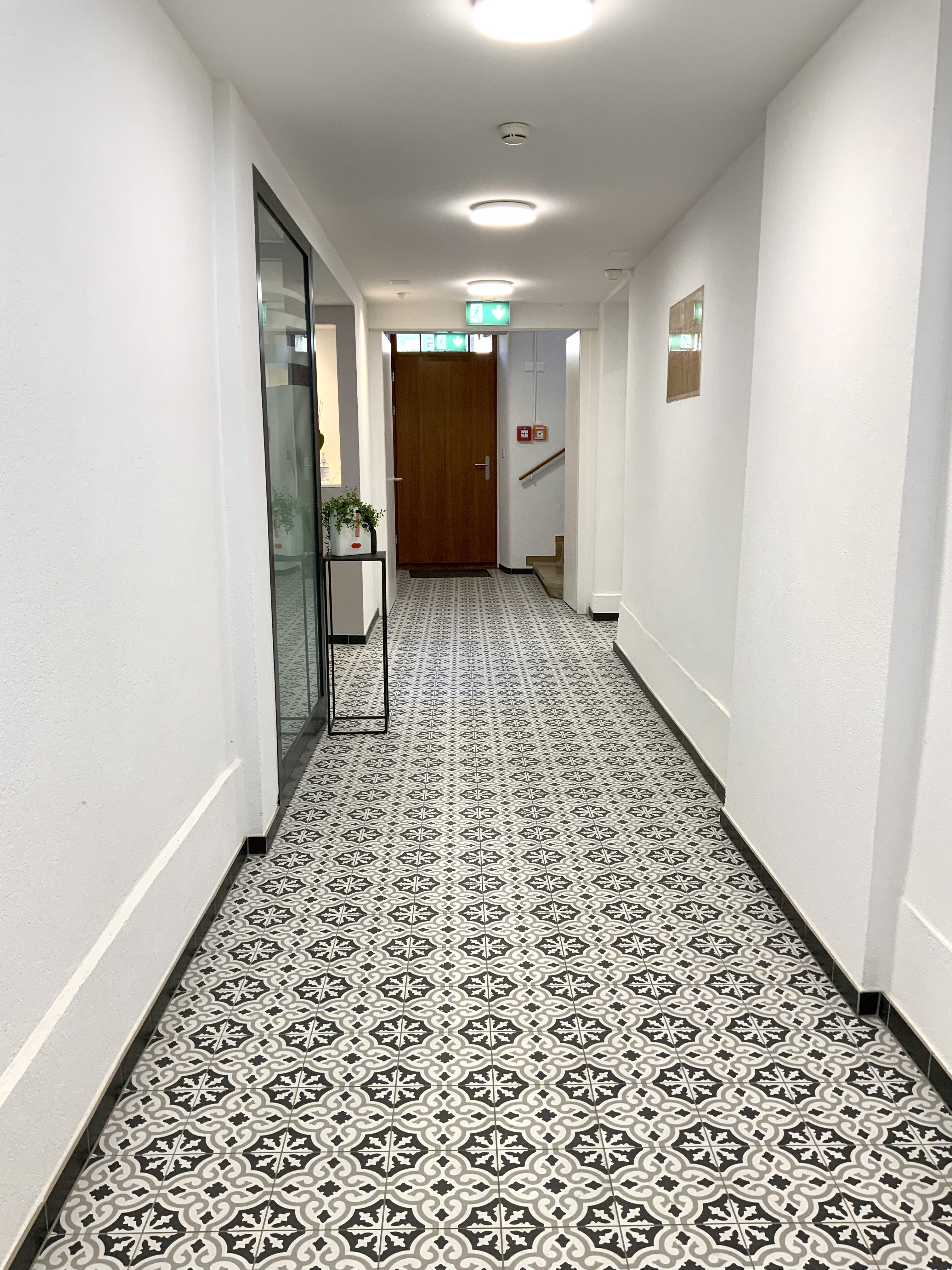 Carreaux de sol en grès cérame italien de Unicomstarker. Une décoration importante qui rappelle les carreaux de ciment des bâtiments du XXe siècle, d’un goût classique et élégant. La couleur noire sur fond blanc et beige souligne sa sobriété intemporelle.